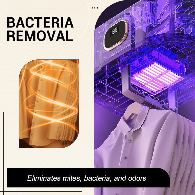 Plus qu'un simple séchage, l'appareil contribue à maintenir la propreté. L'air chaud élimine les bactéries et les acariens, tandis que la technologie à ions négatifs intégrée neutralise les odeurs. Ainsi, vos vêtements sont non seulement secs, mais aussi hygiéniques et sentent bon.