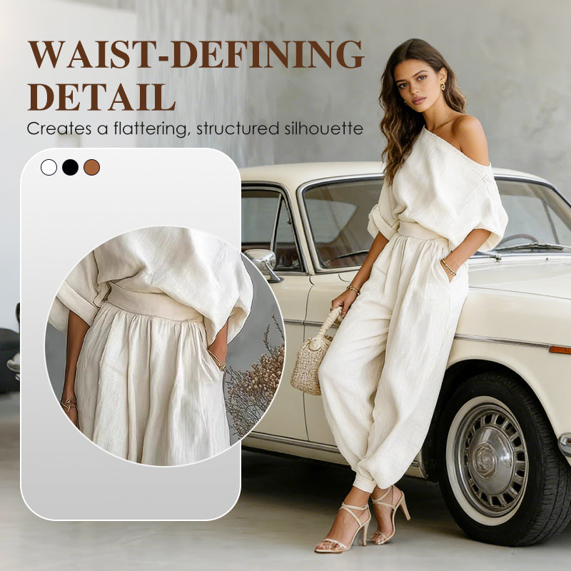 ENCOLURE ASYMÉTRIQUE À UNE ÉPAULE - Offre un look moderne et sophistiqué qui met élégamment en valeur la clavicule. Ce détail chic rehausse cet ensemble décontracté, le rendant parfait pour les sorties en journée comme pour les soirées, avec une grâce naturelle.
