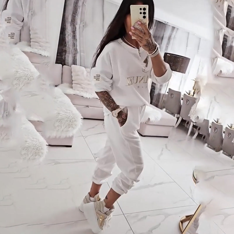 Cet ensemble haut manches longues et pantalon propose une coupe décontractée et flatteuse. Son design coordonné facilite la création d’un look chic et sans effort, adapté à de nombreuses occasions et morphologies.